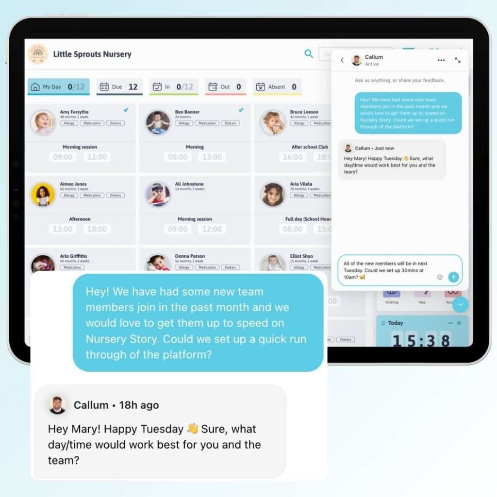 The platform allows parents to receive real-time updates, view daily reports, and communicate directly with nursery staff through the parent app.