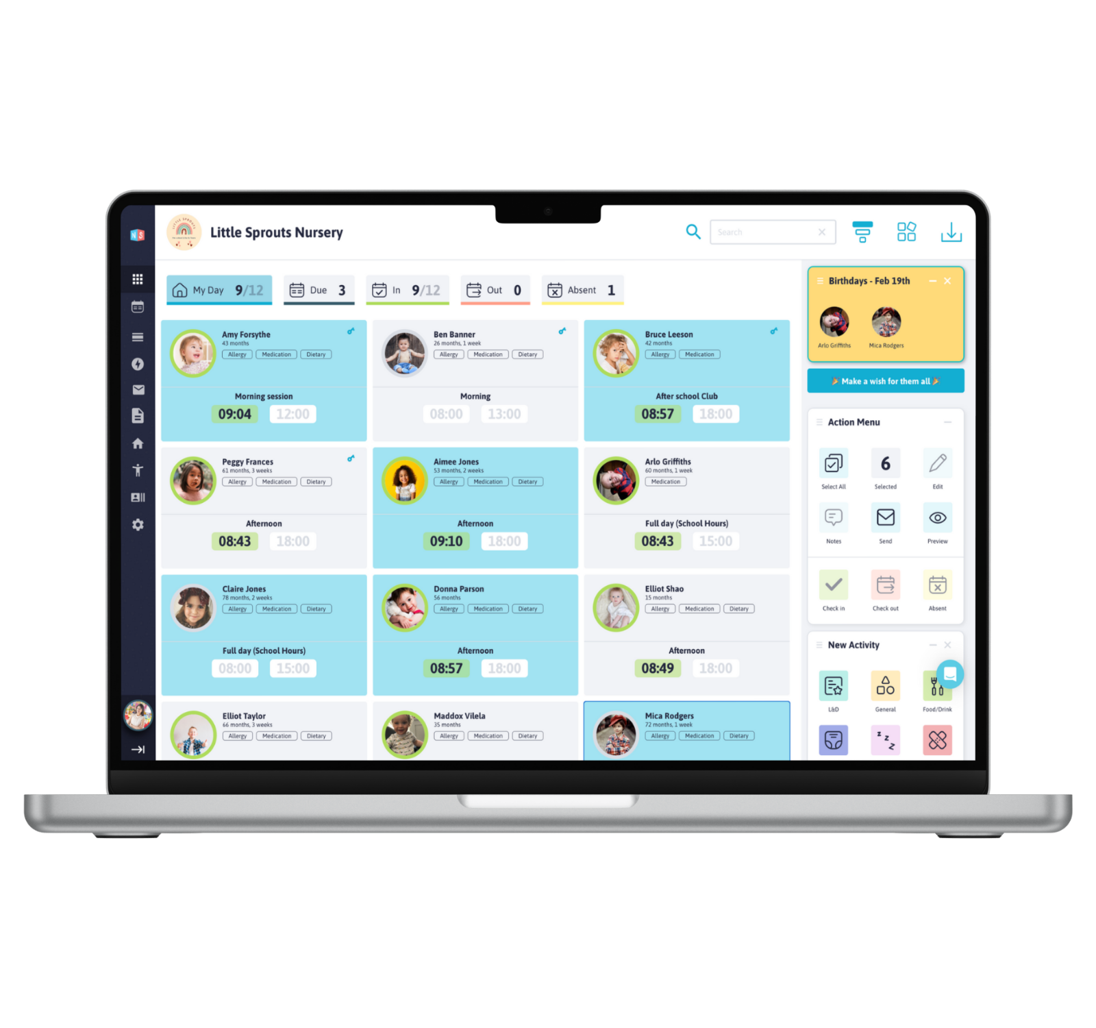 Mark absences, meals or sign-outs with one tap for multiple children.